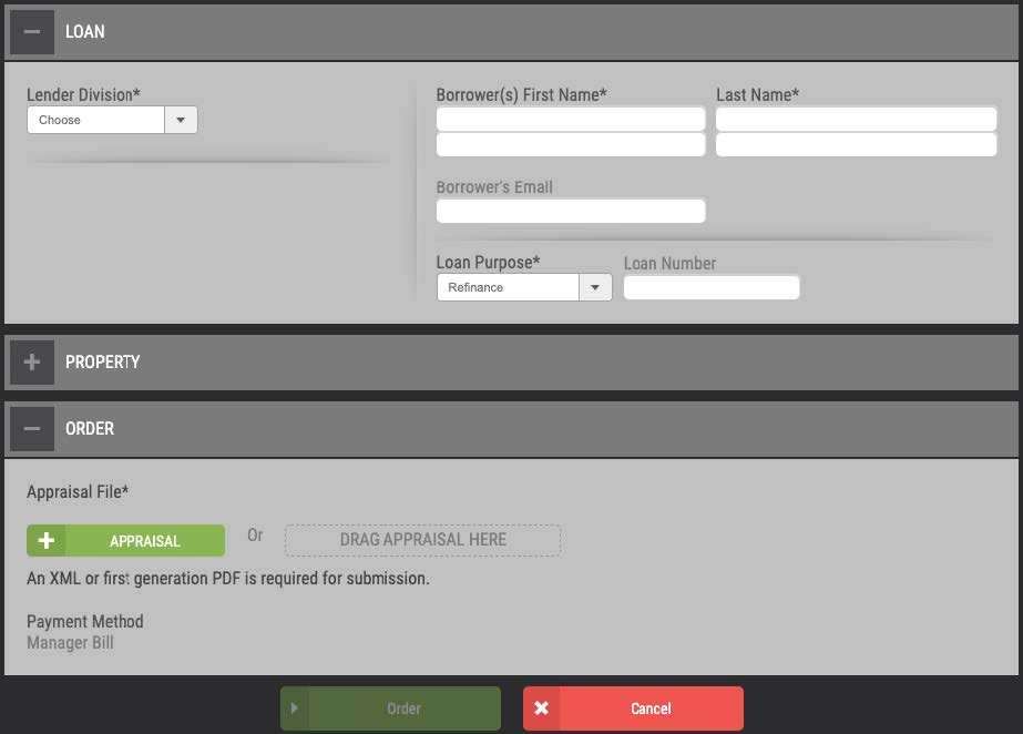 In the Order section, users will need to have access to the completed appraisal file. Scorecard requires either an XML-formatted version of the appraisal (preferred), or a 1st generation PDF formatted version of the appraisal.