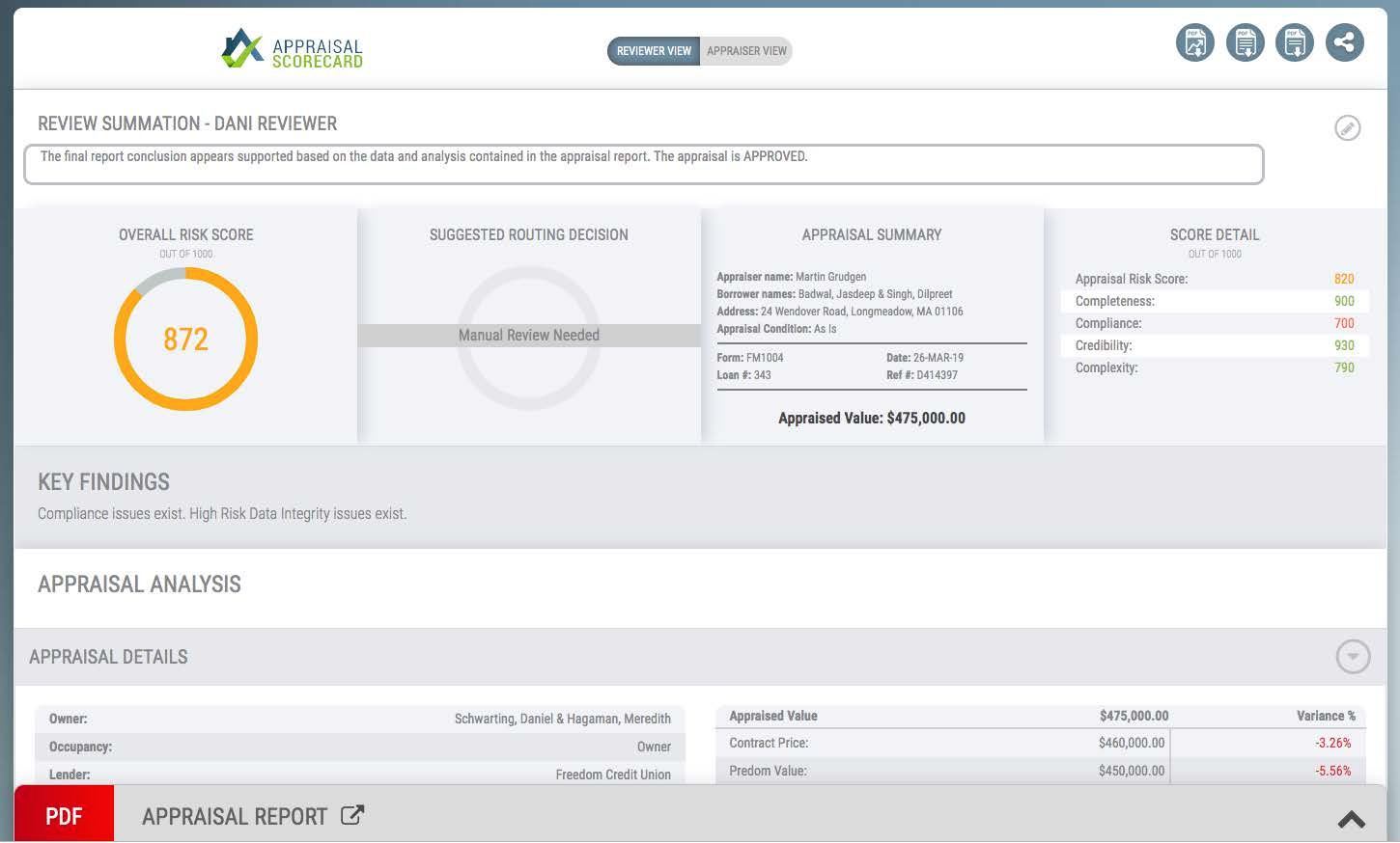 Once uploaded, click the Order button. The Appraisal Scorecard will review the file in moments, and return an output (see sample below) which will highlight potential issues that were identified with the appraisal review.