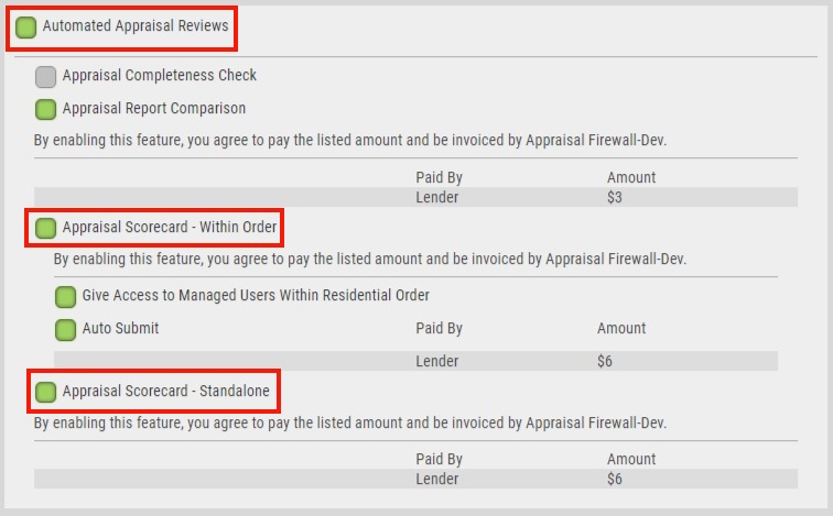 Two options for Appraisal Scorecard will be available: Within Order or Standalone. Within Order means users can run the scorecard automatically or manually within a full appraisal order. Standalone grants users the ability to place an independent order, where a full appraisal order was not required. Select the boxes adjacent to Enable Appraisal Scorecard - Within Order or Enable Appraisal Scorecard - Standalone as available options to order. If you want to override the overall Scorecard pricing for the lender, enable Override Default Pricing, enter the desired lender/division specific pricing, and SAVE.