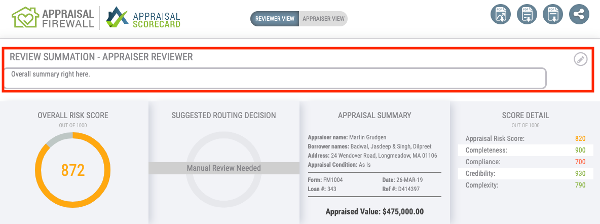 Additional Appraisal Scorecard EnhancementsAbility to Add General Notes to Scorecard in New Review Summation Section What sets the Scorecard apart from the competition is not only the ability to instantly provide accurate insights into the appraisal: it is an appraisal risk management hub for lenders, reviewers and underwriters to jointly collaborate. We have extended the ability to collaborate on Scorecard results: users can add general notes about the entire appraisal review into the Review Summation section. This can help users get a better idea about the entire appraisal and the approval or rejection of it.