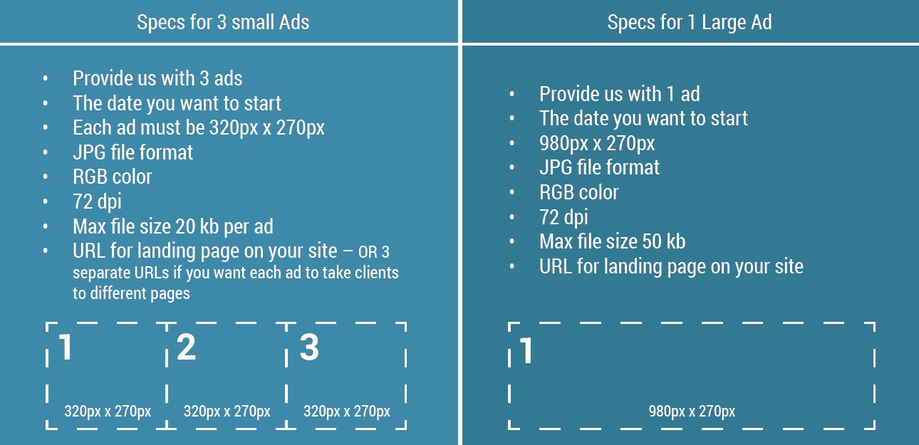 Getting started advertising products and services on your credit report is easy! Just review which offering you want (3 small ads across 1 row, or 1 large ad across 1 row), then provide us with imagery and landing page links for each.