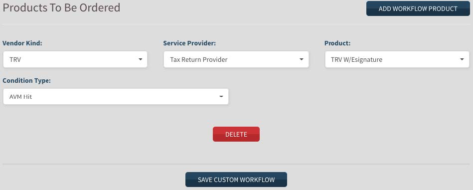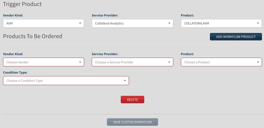 Existing custom workflows can have additional products added as the need arises for your clients ordering efficiency. From the Workflow tab, look for the Custom Workflow section. Select a workflow listed and choose Add Product. Once you have added the appropriate Workflow Type, Vendor Kind, Service Provider, Product and Condition Type, click the SAVE button. Please note only one trigger product per workflow is allowed.