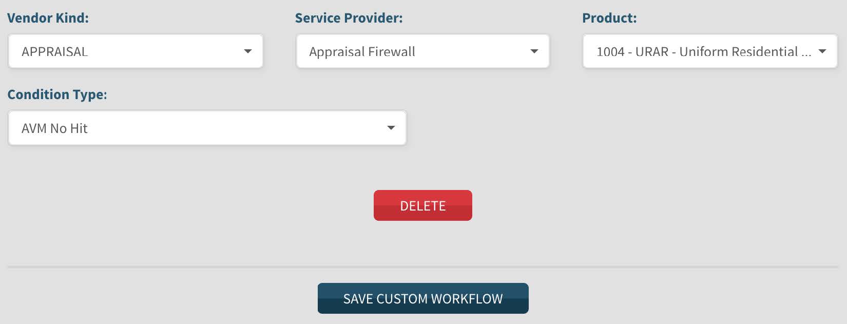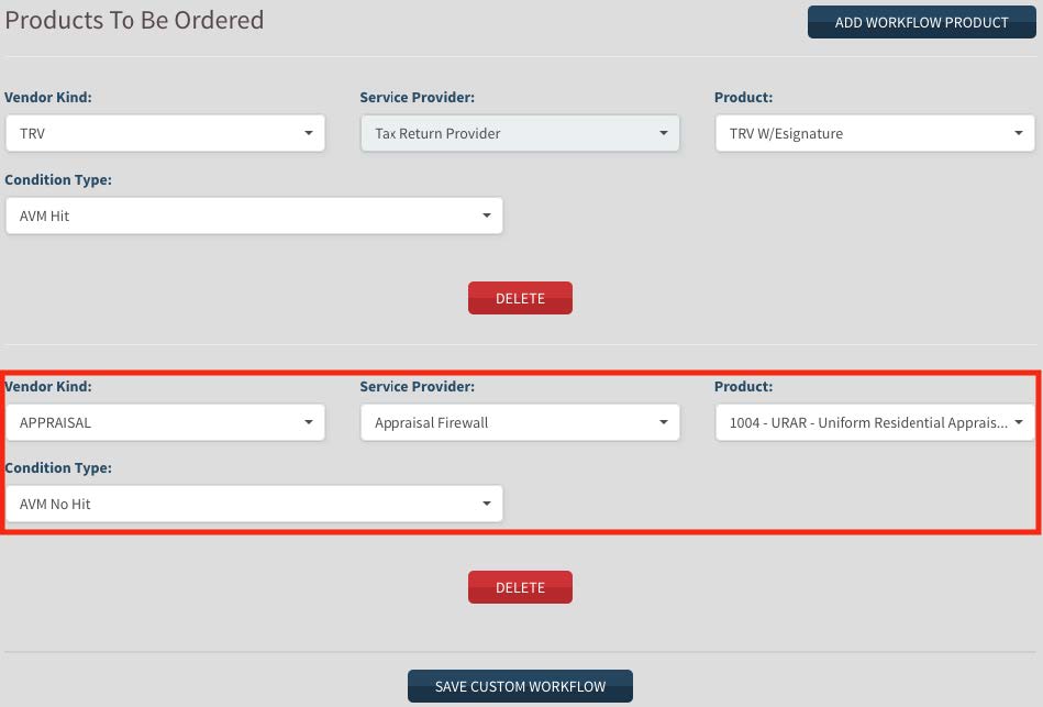 6. To add more Products to be Ordered, click the Add Workflow Product button again. Follow this same process to add multiple Products to be Ordered that will line up with all the Conditions you set on the Condition Type setting. In this example, on the NO HIT condition, a full 1004 appraisal product will be ordered.