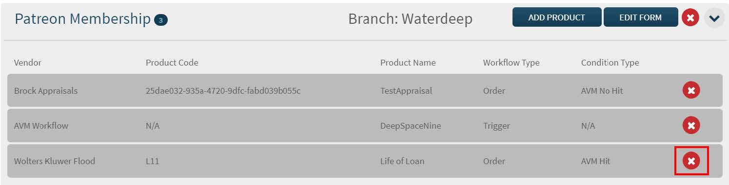 To remove an existing product, select the red circle to the right. The product will be removed entirely from the workflow.