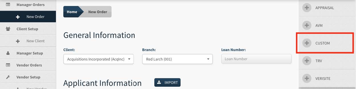 When the branch user next logs in to place a new order, and they click the New Order menu option to begin filling out the General Information section, they will have a new product available to them on the right-hand side of the screen called Custom.