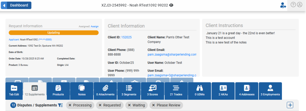 When you open a file from the Workflow tab, All Orders or dynamic Search tab, you will be taken to the top of the Request Detail page. Here you will view summary information, client instructions, and the rest of the account detail. This is where you will perform any customer service work and can view all the bureau data that went into the file, including the raw bureau data.