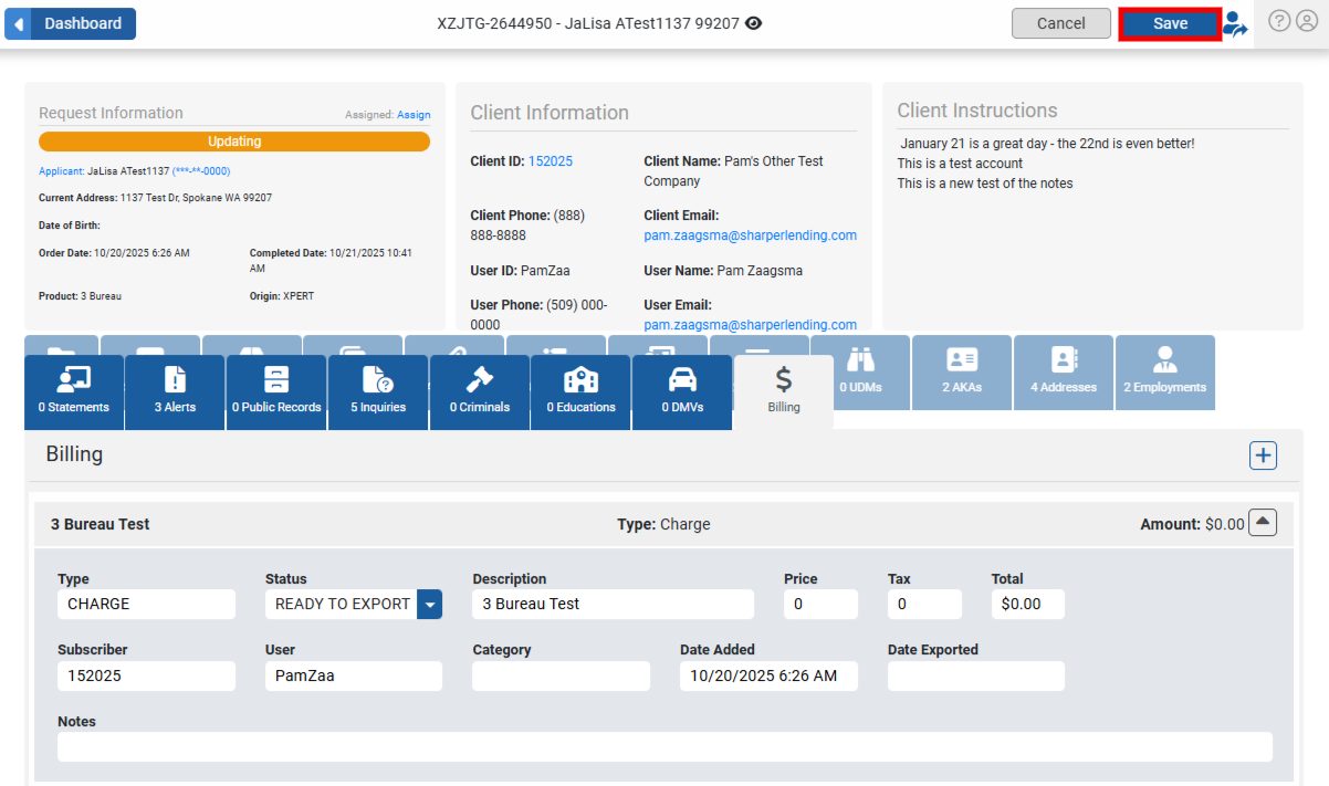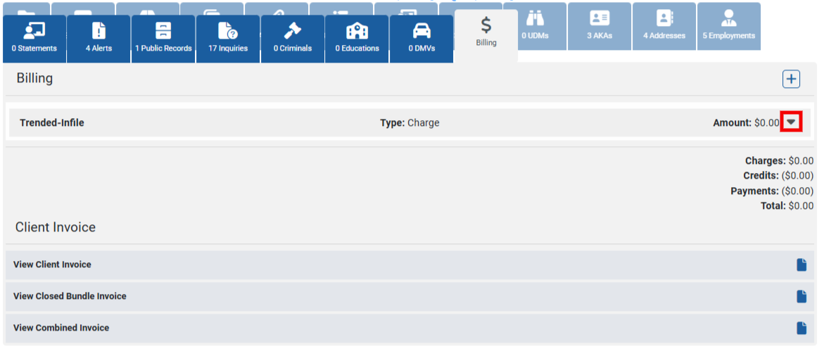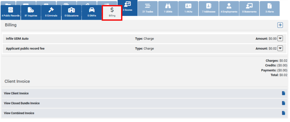 Access the Billing tab within a file to view and reconcile all billing items for this request. You can add charges, credits, and payments directly from the Billing tab.