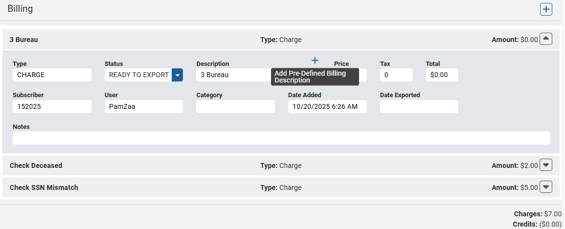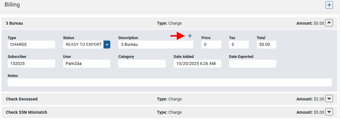 Find the Description field. If a Billing Description has already been assigned, this field will have a description already in place. The + sign will be present above the Description field if the currently applied Description has not been added to the default list of billing description options. Users can select the + to instantly add the displayed Description to the default list.