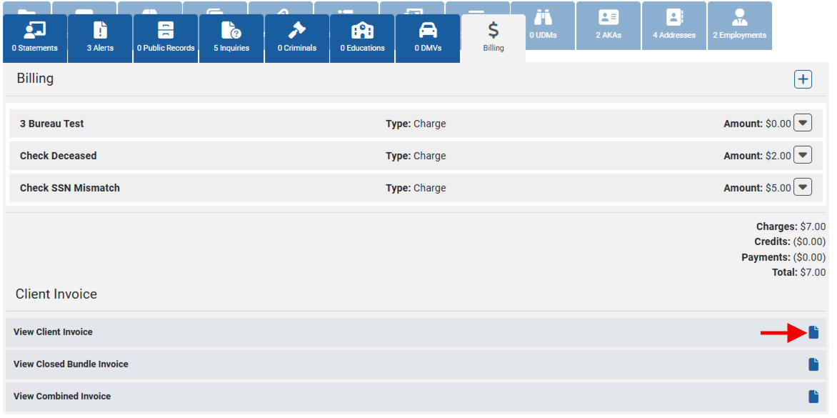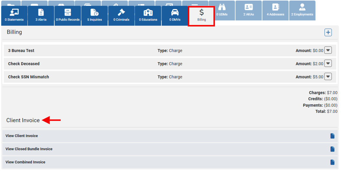 Users can view different invoice types directly from the Billing tab. Client, Closed Bundle, and Combined Invoices are all accessible under the Client Invoice section.