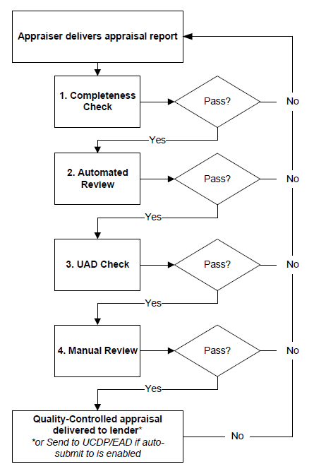 As you can see, manual appraisal reviews are performed after the Completeness Check (if enabled), Automated Appraisal Review (if enabled), and the UAD check (if enabled). Here is a flowchart of the post-delivery QC review process.