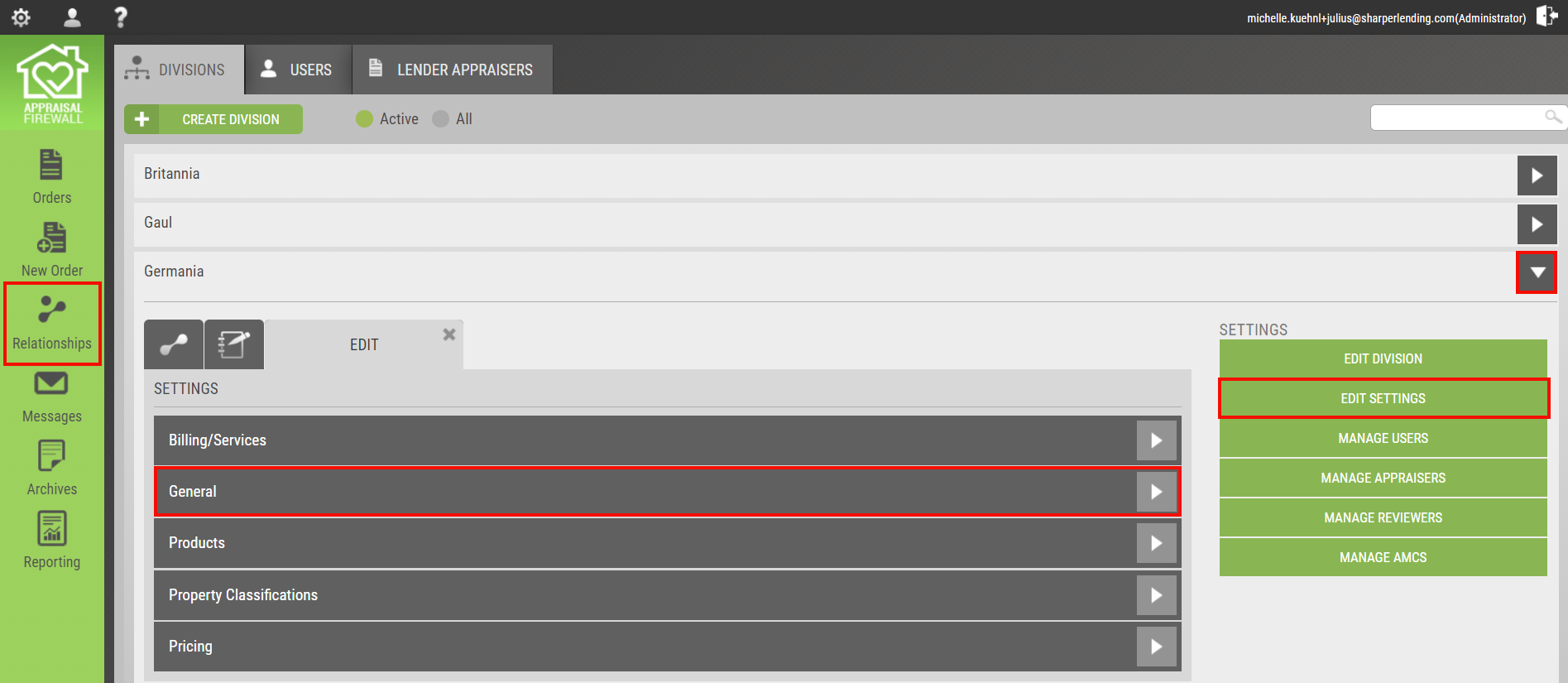 The Residential Bidding feature takes the logic behind the Commercial order requesting bids process and merges it with the traditional Residential round-robin panel rotation. To enable Residential Bidding, access Relationships, chose a Division, select Edit Settings, and expand the General section.