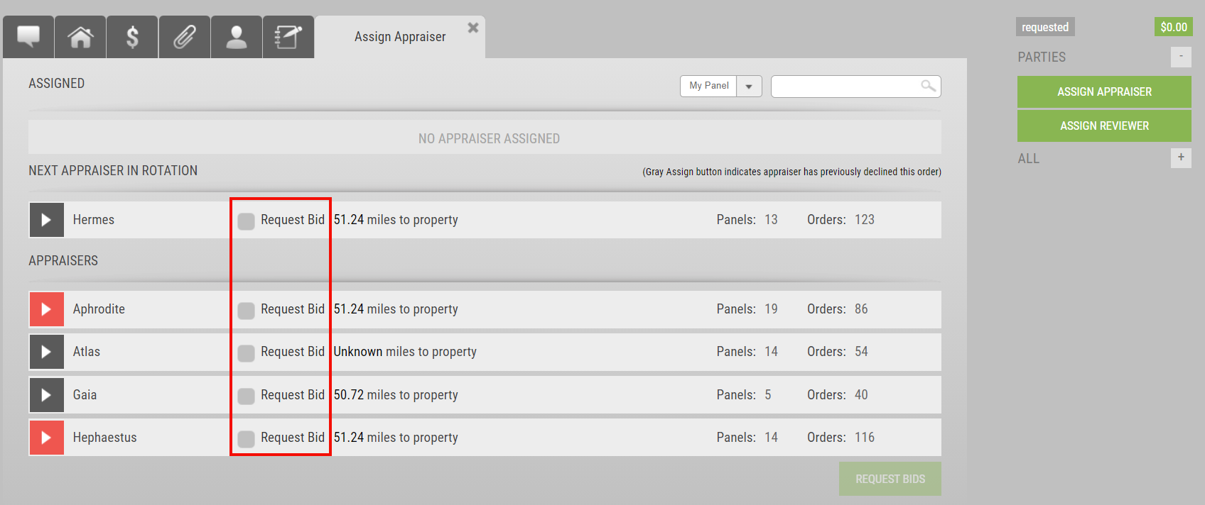 Like manual assignment with a non-bidding residential order, a list of eligible appraisers will be displayed. Enable the Request Bid option for any appraisers you would like to send a bid request.