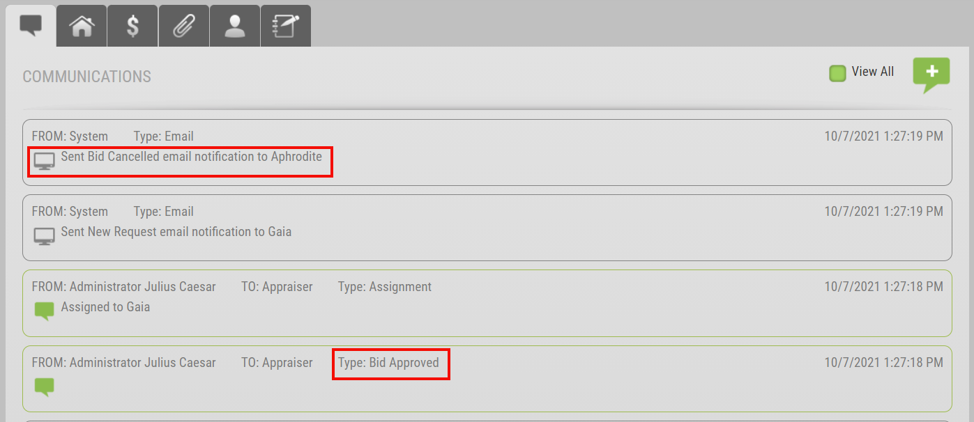 The Communication Log will show each bid request sent out to an appraiser, reflected as Bid Request to Appraiser 1, etc. The following screenshot is from an Administrator’s account, which is why the appraiser’s name is visible.