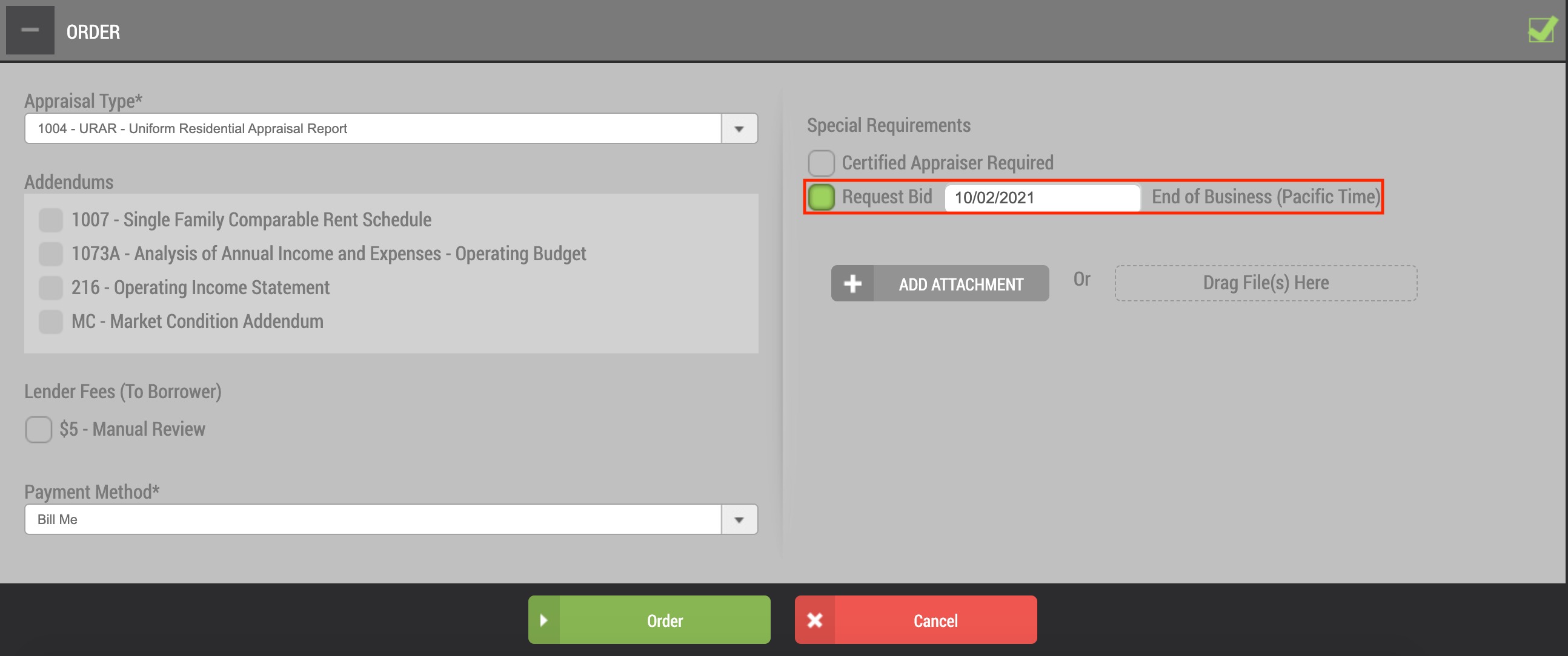 Once the Residential Bidding feature has been enabled, you can utilize the function on New Order placement. Choose Residential from the New Order menu option. The bid request can be found towards the bottom right-hand side under the Order section on the New Order screen. To ensure the order is placed as a Residential Bidding order, enable the Request Bid box, and enter a date. This is the date you want your appraisers to submit their bids.