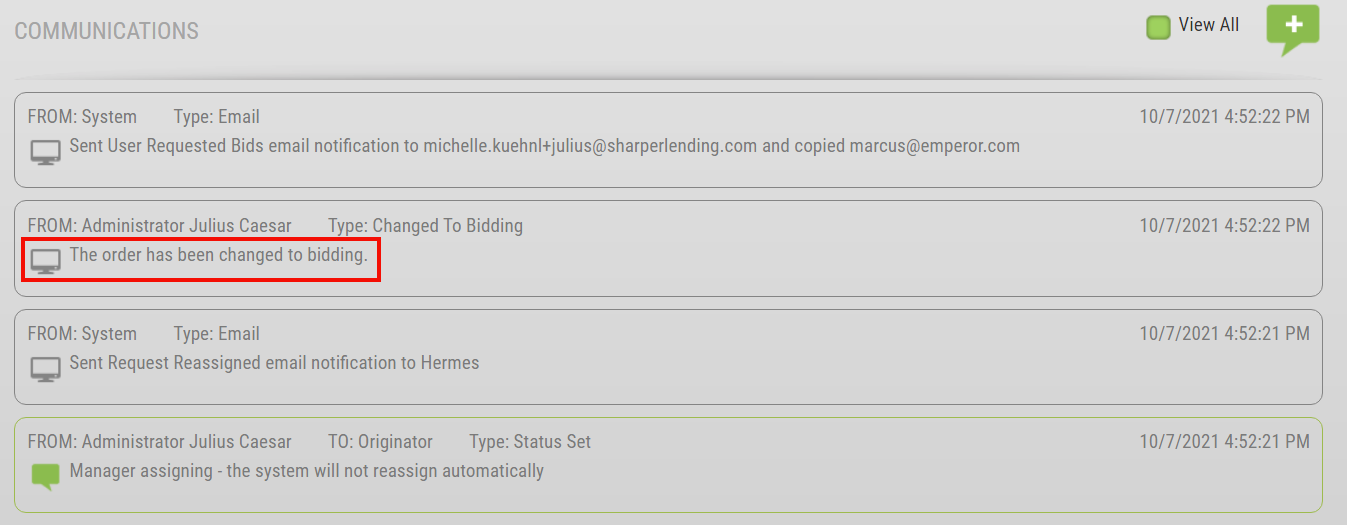 The Communication Log will note the order has been changed to bidding to aid in tracking purposes.