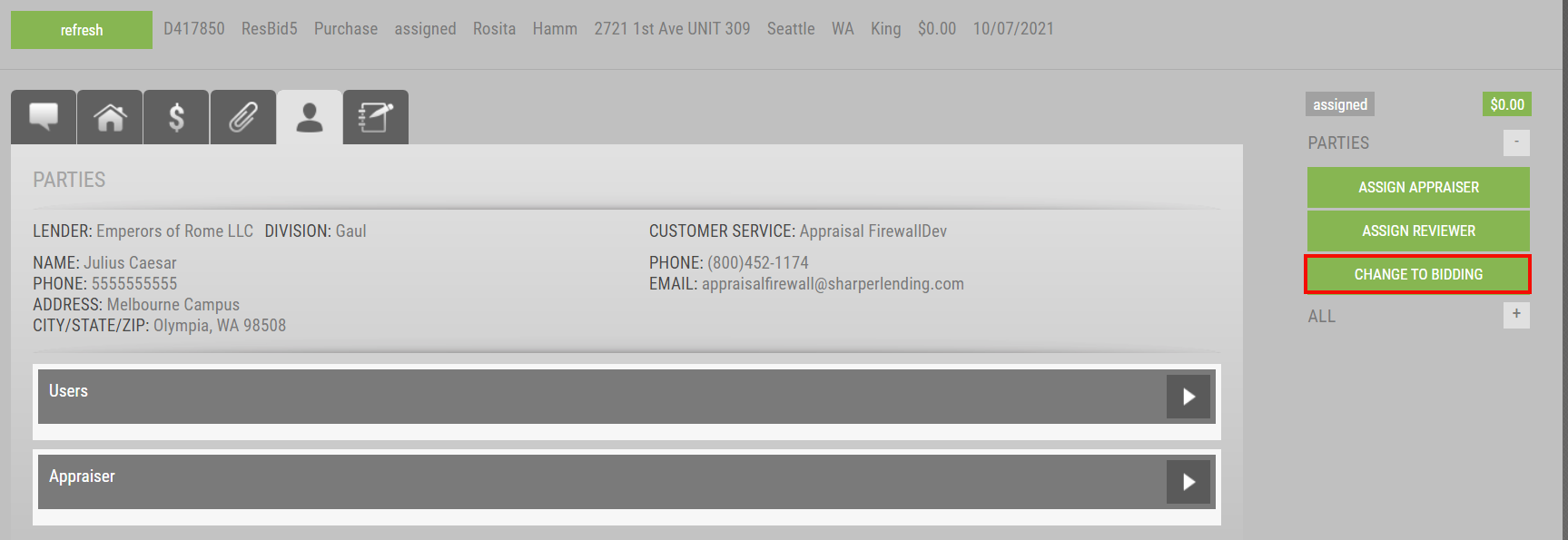 When you enable the Allow Bid Requests feature on your division, traditionally placed residential orders can be changed to bidding. This can be advantageous if you need to cast a wider net to get your order assigned quicker. To change a normal residential order assignment to bidding, select the Parties tab, and choose the Change to Bidding option on the right.