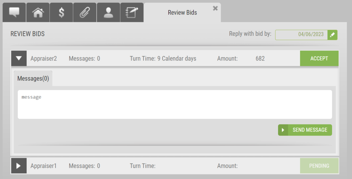 Based on the bid submissions you receive; you can award the bid to the appraiser by selecting Accept.