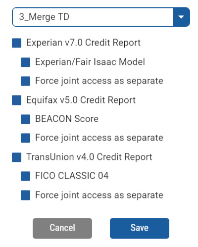 - For checkbox products, select which bureaus, scores and access addons you want to add or remove, then click Save to change the product.