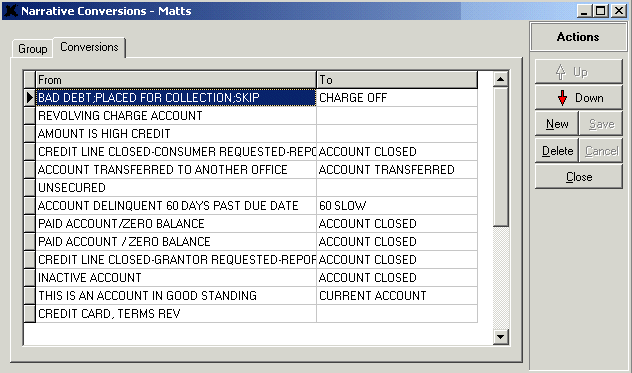 To setup a custom narrative conversion, click the Setup menu option and choose Conversions | Narratives. The Narrative Conversions screen will then open, displaying a Group tab—this is where you can begin customizing bureau-reported narratives.