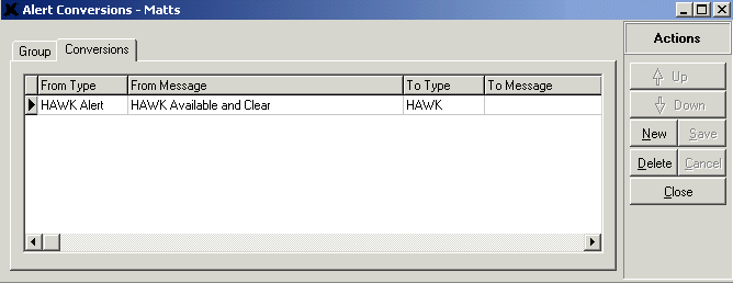 Next, click the Conversions tab. This is where you will customize bureau-reported alerts to your liking. Begin by clicking the New button located in the Actions section. When you do this, a row will become highlighted in blue with an asterisk to the left of it. You can begin adding your customized Alert conversions into the row that has the asterisk to the left of it—single click in the From Type field to begin. Use the <TAB> key to move from field to field.