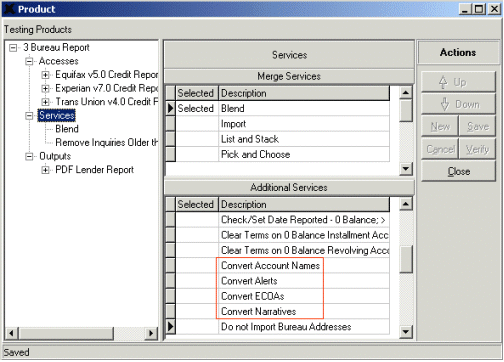 When you have setup the conversion(s) to your liking, click the Save button from the Actions section. When the save is complete, you have setup a customized ECOA conversion. To have this custom conversion work on a request, be sure to align the Convert ECOAs service to a product and select the ECOA Group name from the drop down list when you add the service. If you would like to use the default ECOA conversions (for XPN, TC/EFX, TC/CU, or TC/XPN only), then enable this service without selecting a group.