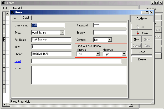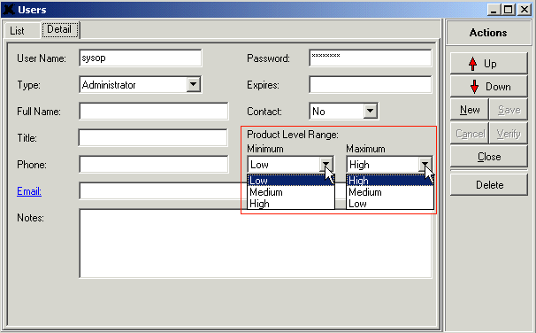 - When viewing your client companies from the Setup | Clients menu option, click on the Users button. In the Users window, highlight a specific user and switch to the Detail tab. Look for the Product Level Range section – you will see a Minimum and a Maximum drop down list.