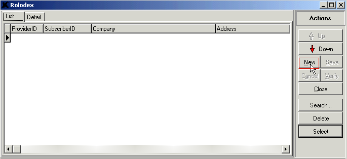 If you click the Lookup button and XOP finds no matching Subscribers in your rolodex, the Rolodex window that opens will be blank. From here, if you happen to know the Subscriber information that should be used for this account, you can input it at this time by clicking the New button and adding a new rolodex entry.