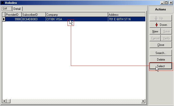 XOP will then perform a streamlined search on the existing account information and open all close matches into a Rolodex screen. If the matching Subscriber information for this account exists in the list, you will want to bring the Subscriber information over into the Detail tab for this account. To do this, single-click on the Subscriber entry and click the Select button.