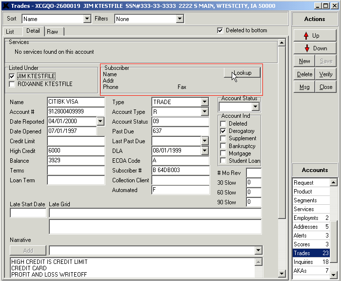 No matter what type of account screen you are viewing—be it trade line or collection account, address or employment account detail screens—if incomplete Subscriber information imports from the bureaus, you can always search your rolodex for the proper information. XOP will do its best to match the account information reported by the bureaus with the information that exists in your rolodex when you do a lookup.