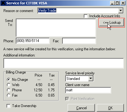 Clicking the Lookup button scans your rolodex for matches and opens a Rolodex screen containing the corresponding information. All matches will be displayed on this screen. If you find the correct Subscriber information, single-click on it and click the Select button to populate the selected Subscriber’s information into the Send To field on the account verification form.