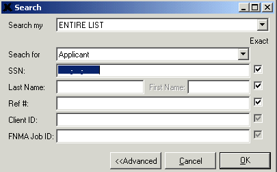 When you see the Exact Search pop up window, you can search for the reference number (Display ID), social security number, last name, or first name. If you want to do a more refined search, click on the Advanced button. The Search window expands to allow you to designate if you want to search the Entire List or the Working List, the reference number, SSN, last name and/or first name, Client ID, and/or Fannie Mae Job ID#. You can deselect any of the checkboxes that correspond to the fields here to perform an inexact search—an inexact search allows users to search for the first couple of digits of a SSN to bring up a list of socials to choose from, or to search for the first few letters of a last name to bring up a list of names to choose from, etc.