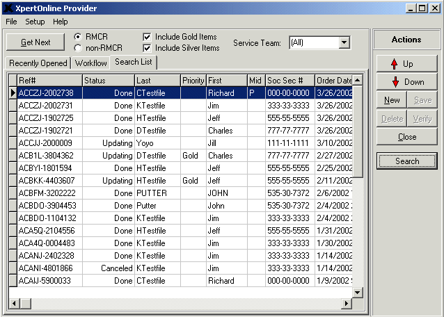 Below the menu options is the Get Next/Workflow functionality section. The Workflow pages and Get Next button are based on work in XOP. No matter if you have Administrator or User rights, the Workflow options automate the process of finding and managing outstanding work in the form of RMCR or non-RMCR (Infile) requests that need your manual attention. Instead of sorting through the numerous requests that already exist in XOP, updaters/processors (users setup with User rights) and managers (users setup with Administrator rights) can use the Workflow tab and the Get Next button to view and open outstanding requests ordered by oldest service date/time stamp and priority level.