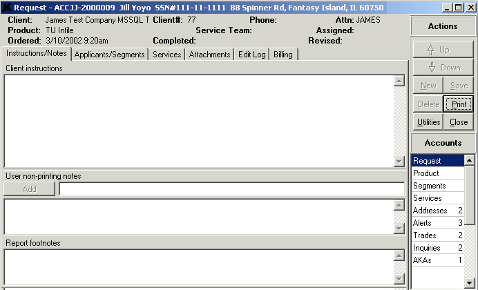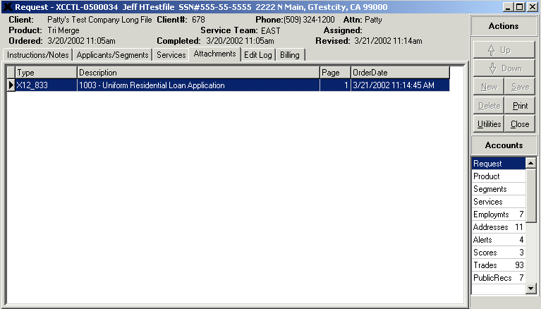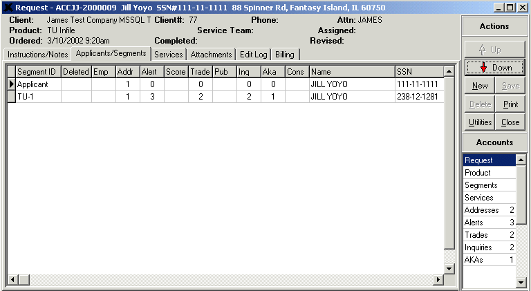 This tab shows the user the Applicant and, if applicable, the Co-applicant information. The Applicant/Co-applicant information is listed at the top of this tab, and the bureau segments that make up the account detail on this request are listed below the Applicant/Co-applicant. As you can see from the layout of this screen, the user can get a feel for how much information makes up this request from the number of employments, addresses, alerts, scores, trades, public records, inquiries, AKAs, and consumer statements listed in the corresponding columns.