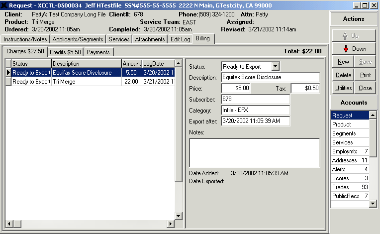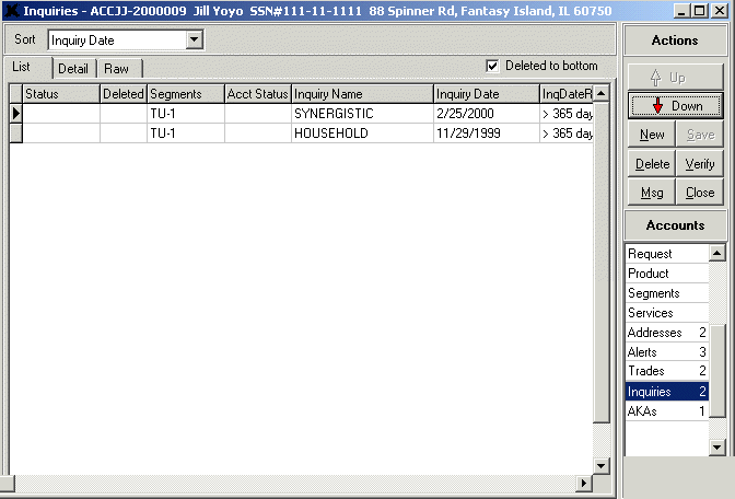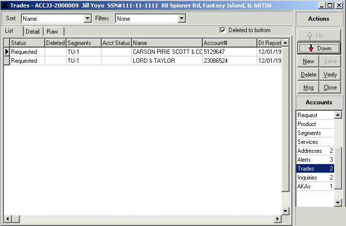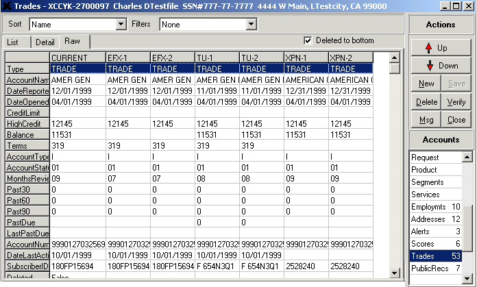 The main make up of the List tab is the grid section that lists the actual accounts for this request. The column headers along the top of the grid include status information, if this account has been deleted, segment information, account name, account number, date reported, date opened, high credit, balance, and other summarized detail information concerning each account. Each item on this tab can be edited—users can simply highlight a value and begin typing. However, we always recommend that an account’s detail be edited from the Detail tab. To do this, highlight the account you want to edit and click the Detail tab (or, double-click a selected account).
