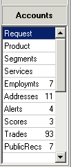 Below the Actions section is the Accounts section. This shows the user the types of accounts that make up this request. Double clicking on an entry in the Accounts section opens the corresponding account list, account detail, and raw tabs for that type of account. To facilitate your workflow, the Accounts section is included on every account list and account detail page that you can open so that you can easily move from the trades accounts to the public records accounts, for example.