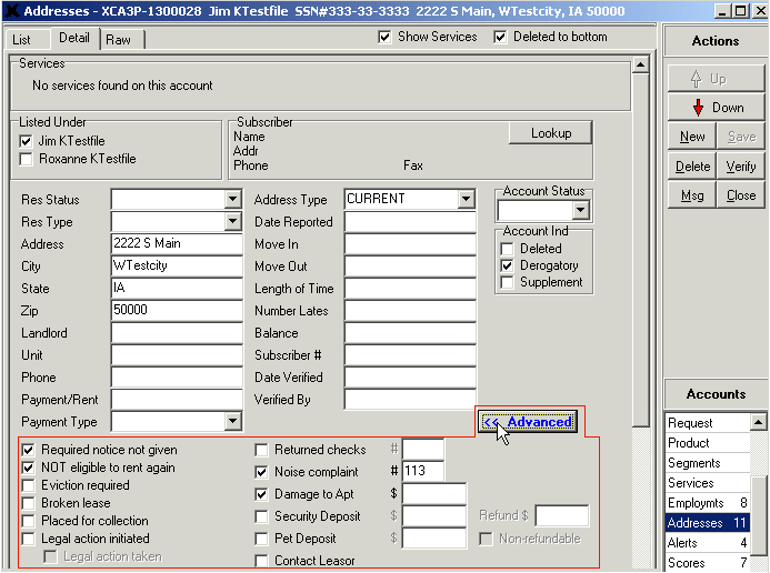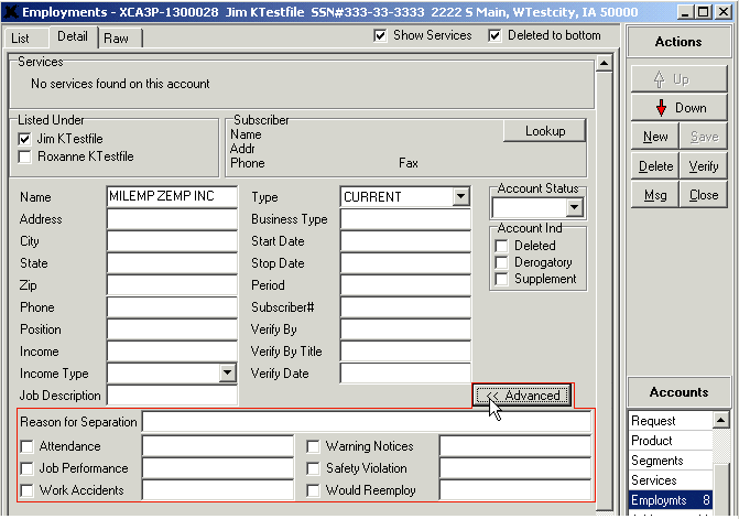 The Employments and Addresses account Detail screens include employment and tenant screening information. These fields are collapsed by default, but when viewing the Detail tab for any address or employment reported by a bureau, or added manually, users can click the Advanced button located in the middle of the Detail tab to view the checkboxes and/or fields pertaining to employment and tenant screening. These checkboxes and fields need to be updated manually, meaning that the bureaus will not report this information for the Applicant/Co-applicant. When any of the checkboxes/fields below the Advanced button are populated with information and saved, the Advanced button will be highlighted—it will appear blue with bolded text. This is so that updaters/processors can use the Up/Down controls in the Actions section of the Detail tab to determine which employments/addresses contain manually-entered employment or tenant screening information.