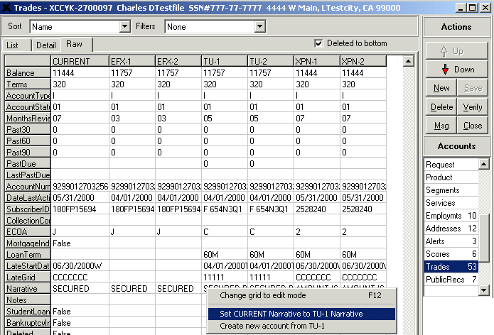On requests that have been merged (products with either the Blend or the Pick and Choose service enabled), updaters/processors can delete the base, or kept, account, and then undelete another account that was merged with the base account to create a new account. This can be done easily from the Raw tab: users can right-click in the column or columns that have the bureau names at the top (EFX-2, for example) and select the Create New Account from XPN-1, for example, to create a new account and set all of the fields for that bureau only. This feature is usually only necessary for Trans Chicago/Fannie Mae requests.
