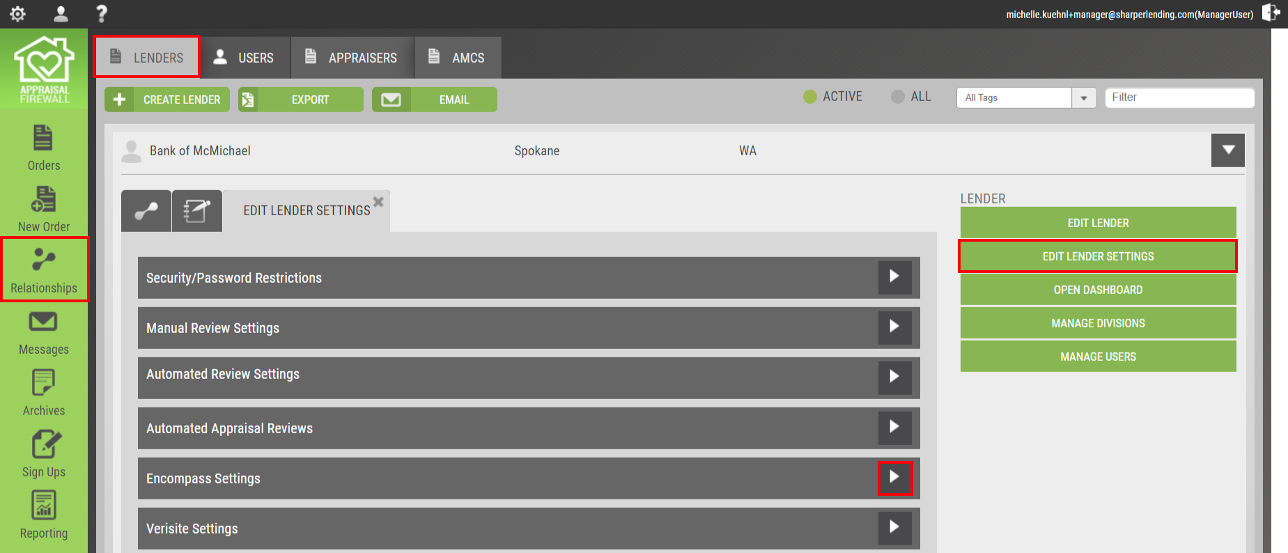 New Enhancements for Managers and LendersAppraisal Scorecard Eligible for Encompass RetrievalThe Appraisal Scorecard report is now eligible to be automatically retrieved into the Encompass eFolder! Users will no longer need to download the Appraisal Scorecard output from Appraisal Firewall directly and manually upload the document to the eFolder within Encompass. This new feature will reduce the time users spend working in both platforms simultaneously and ensure the Scorecard report is applied to the correct loan file. When you enable this feature, the Appraisal Scorecard and any other selected returned documents from Appraisal Firewall will be automatically transmitted back to the eFolder, in a single payload. How to Use This Feature: Login to your Appraisal Firewall Manager User account. Select Relationships along the left-hand side of the screen. From the Lenders tab, expand the lender you wish to enable this feature. Choose Edit Lender Settings and expand the Encompass Settings section.