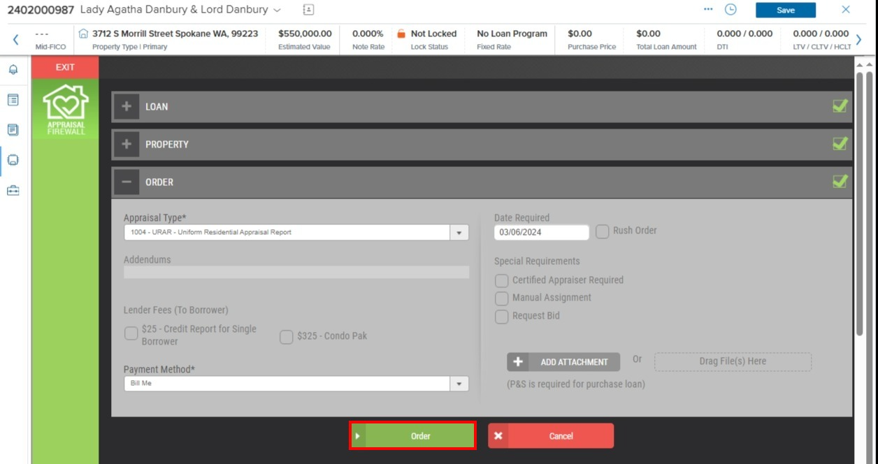 Choosing this option will launch the Appraisal FirewallX New Order screen, where the original order details will automatically populate, including the original form type that was ordered. Once users have reviewed the various section, they can select Order at the bottom of the screen.