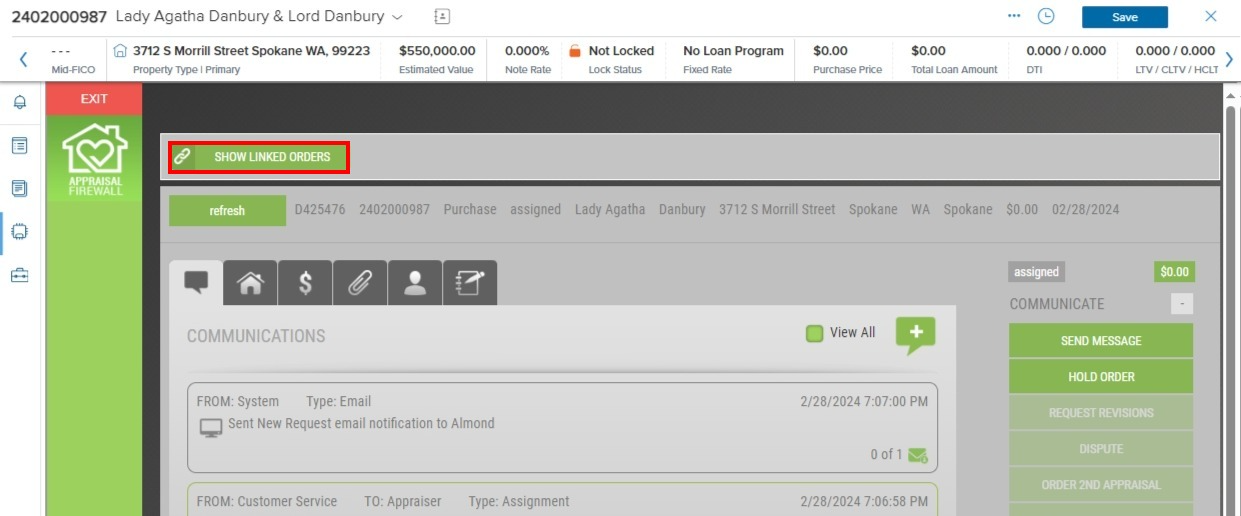 Upon placement, the user will be directed to the Communications Log on the newest order. Along the top, the user can also Show Linked Orders. This feature will display any additional orders pertaining to the parent appraisal order.