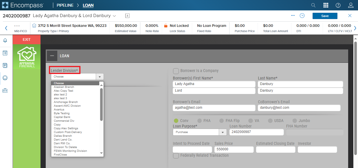 All new orders start with the New Order form. Much of this information, if not all, will populate from your loan in Encompass. If you are attached to multiple divisions, you must first select which Division the order should be placed. Please note: if you are associated with a single division, no division field will be displayed.