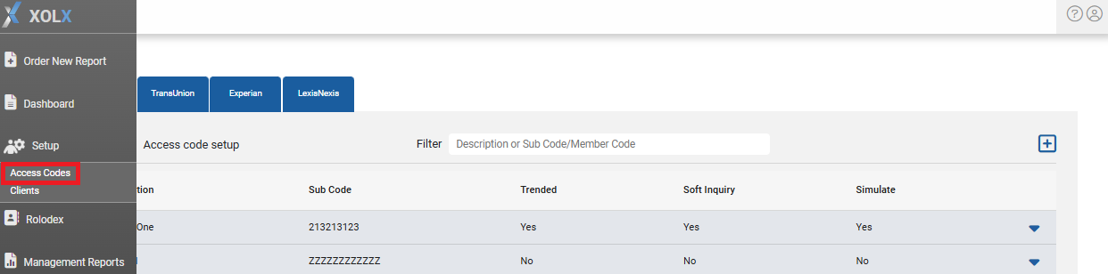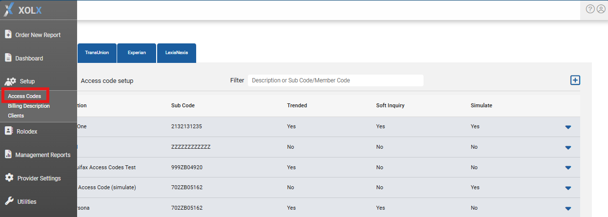 Providers will be directed to a list of existing access codes per bureau. To quickly search for a particular access code per bureau, utilize the Filter feature by inputting a description or code to narrow the results. Each bureau's tab will provide a description, display the sub-code/member code, and indicate if trended data, soft inquiries, and/or simulation are enabled.
