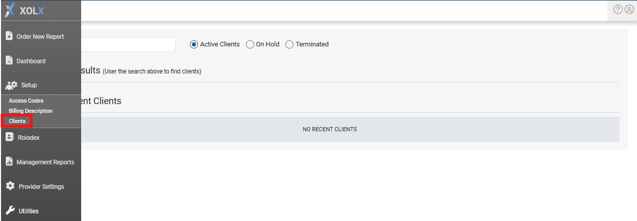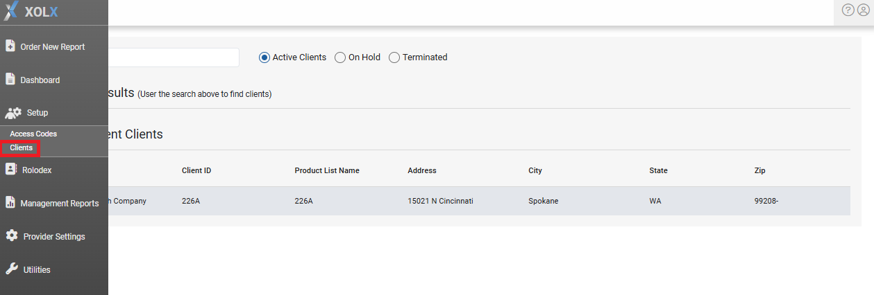 Searching for clients, by default, will populate results for Active Clients. Start by entering a client name, client ID, etc., to generate results.