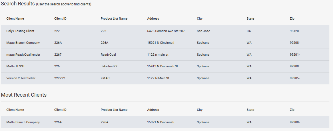 The Search Client field will filter results based on keystrokes. Any recent searches will be listed under the Most Recent Clients section.