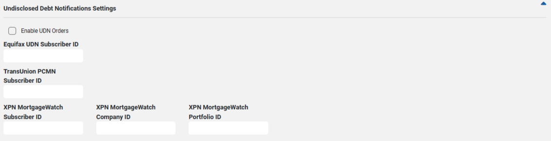 Providers can allow UDN Orders on a per client basis. Additionally, configure notifications to be sent to the client when a UDN is triggered by entering the client's Subscriber IDs per bureau. Once established, the client will be notified when the activity occurs.