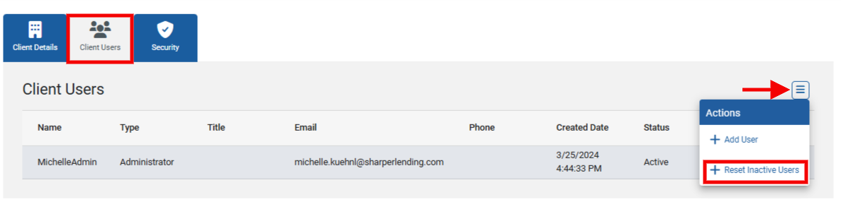 Providers can re-activate any inactive user(s) across the entirety of their organization via the Reset Inactive Users feature. From the Actions menu, choose Reset Inactive Users.