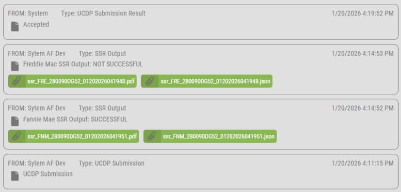 Regardless of whether the appraisal report is sent automatically (i.e., at time of delivery/post-delivery configurations) or manually, Appraisal Firewall X will import the UCDP results and generate the SSR Successful or Not Successful outputs. NOTE: a .JSON output will be included within the SSR output result. This output is intended to provide lenders with more autonomy to parse out any data necessary.